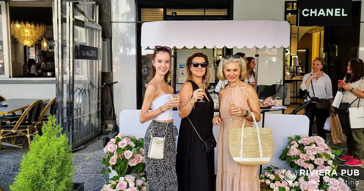 Un triporteur mobile aux couleurs de Chanel était positionné devant la boutique, animé par des hôtesses élégantes. Le public pouvait déguster des macarons à la rose, du thé glacé infusé à la rose, ou encore savourer une coupe de champagne. Des cartes postales parfumées étaient distribuées avec soin, accompagnées de cadeaux exclusifs pour les clientes VIP.