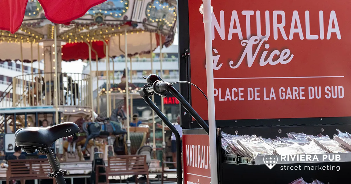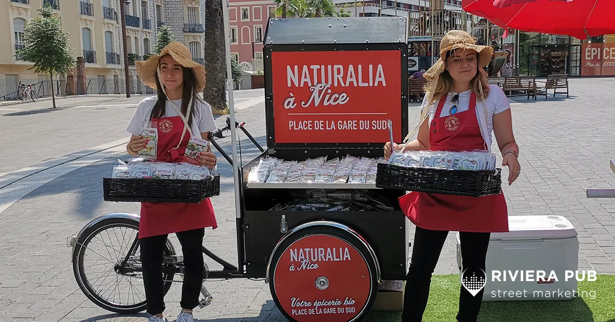 Chaque jour, de 15h à 19h, une équipe terrain composée de 4 professionnels (hôtesses, animateur et régisseur) était positionnée devant la Gare du Sud, dans une zone à fort trafic piéton. Un vélo triporteur type food bike décoré aux couleurs de Naturalia servait de point d’animation et de distribution.